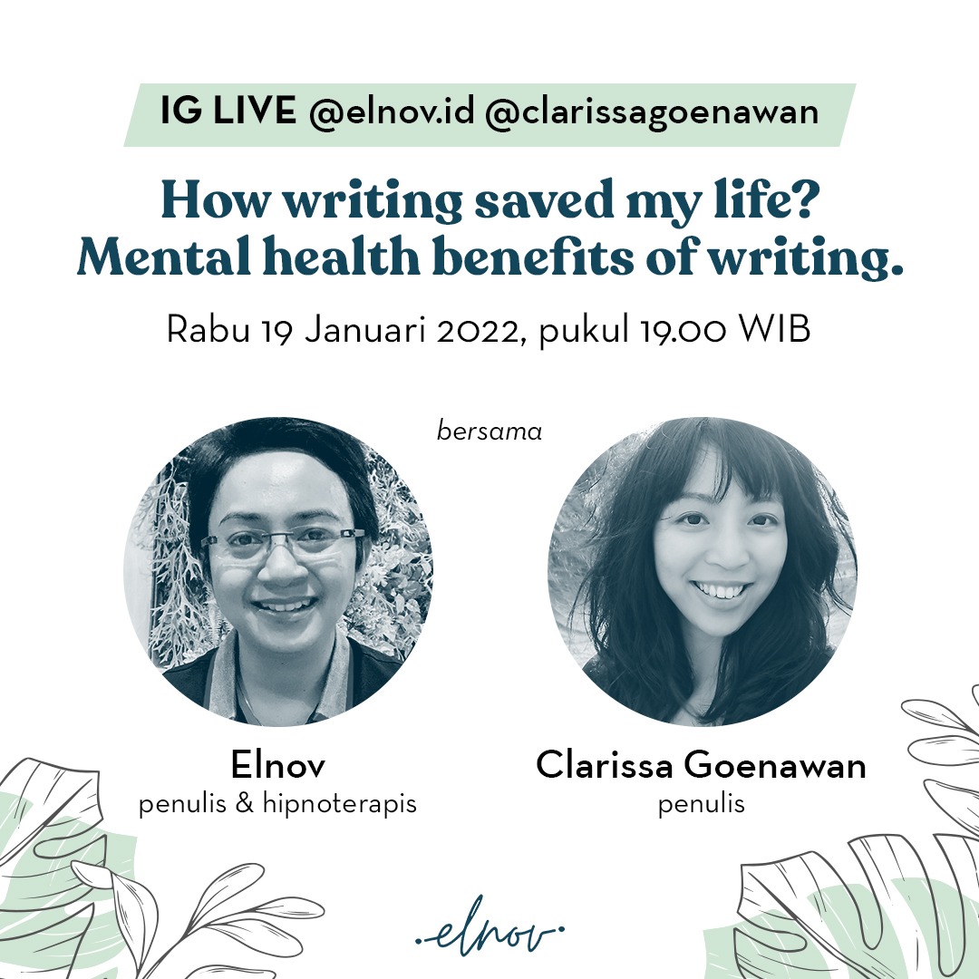 Perbincangan ini bakal seru banget karena kita bisa melihat dua perspektif teman-teman, dari kacamata Clarissa yang seorang novelis dan translator, serta Elnov yang penulis memoar dan hipnoterapis. ✨