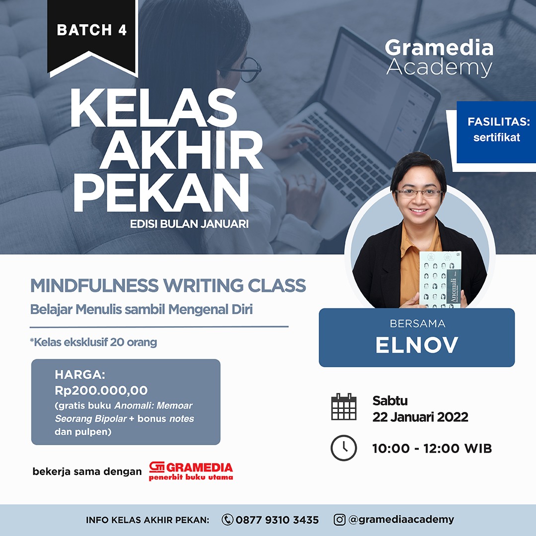 Booklovers, penulis catatan harian, dan calon penulis buku bestsellers, belajar menulis dengan menerapkan mindfulness, yuk! Eksklusif hanya untuk 20 orang peserta. Raih pula kesempatan untuk mendapatkan pendampingan/coaching langsung dalam program berkelanjutan bersama Gramedia Pustaka Utama.